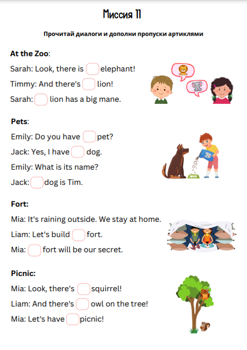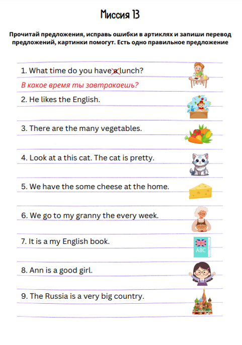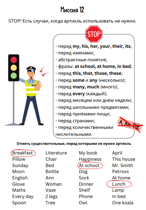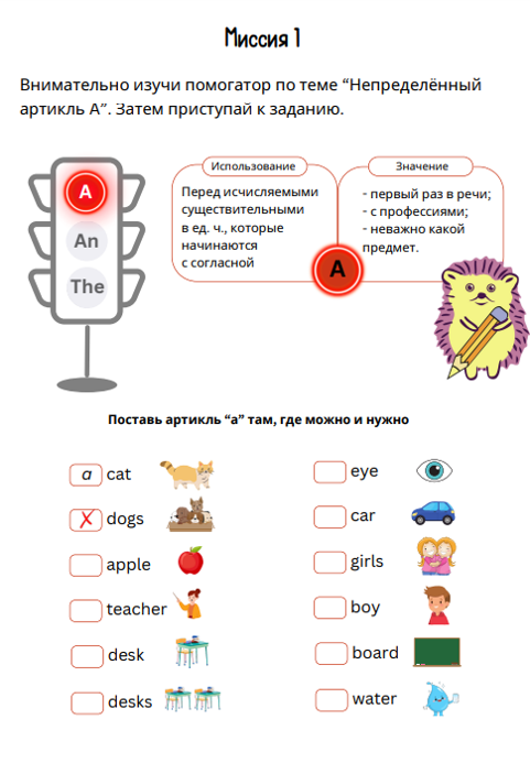 В каждой миссии нашего тренажёра Вас ждут помогаторы по теме «Артикли», интересные упражнения для закрепления полученных знаний, итоговая миссия и отличное настроение!