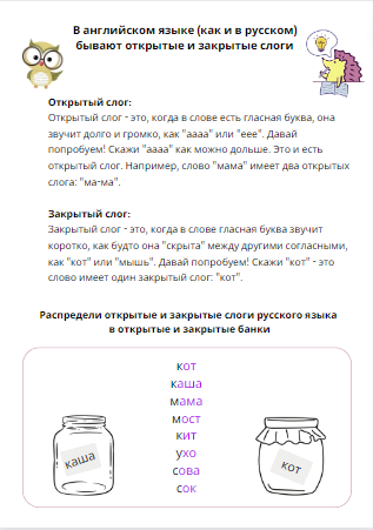 - Познакомится с открытыми и закрытыми слогами в английском языке;