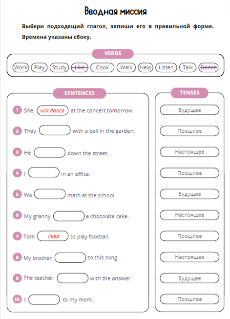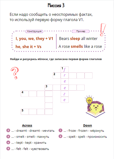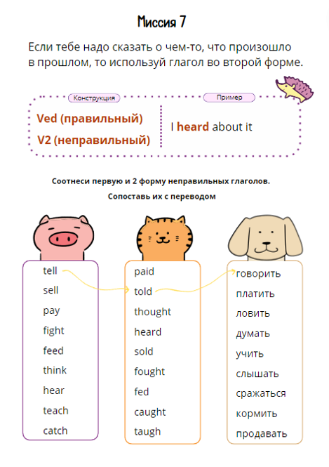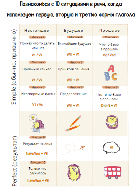 В нашем тренажёре представлены 10 интересных миссий – речевых ситуаций, когда нужно употреблять первую, вторую и третью форму глаголов как правильных, так и неправильных.