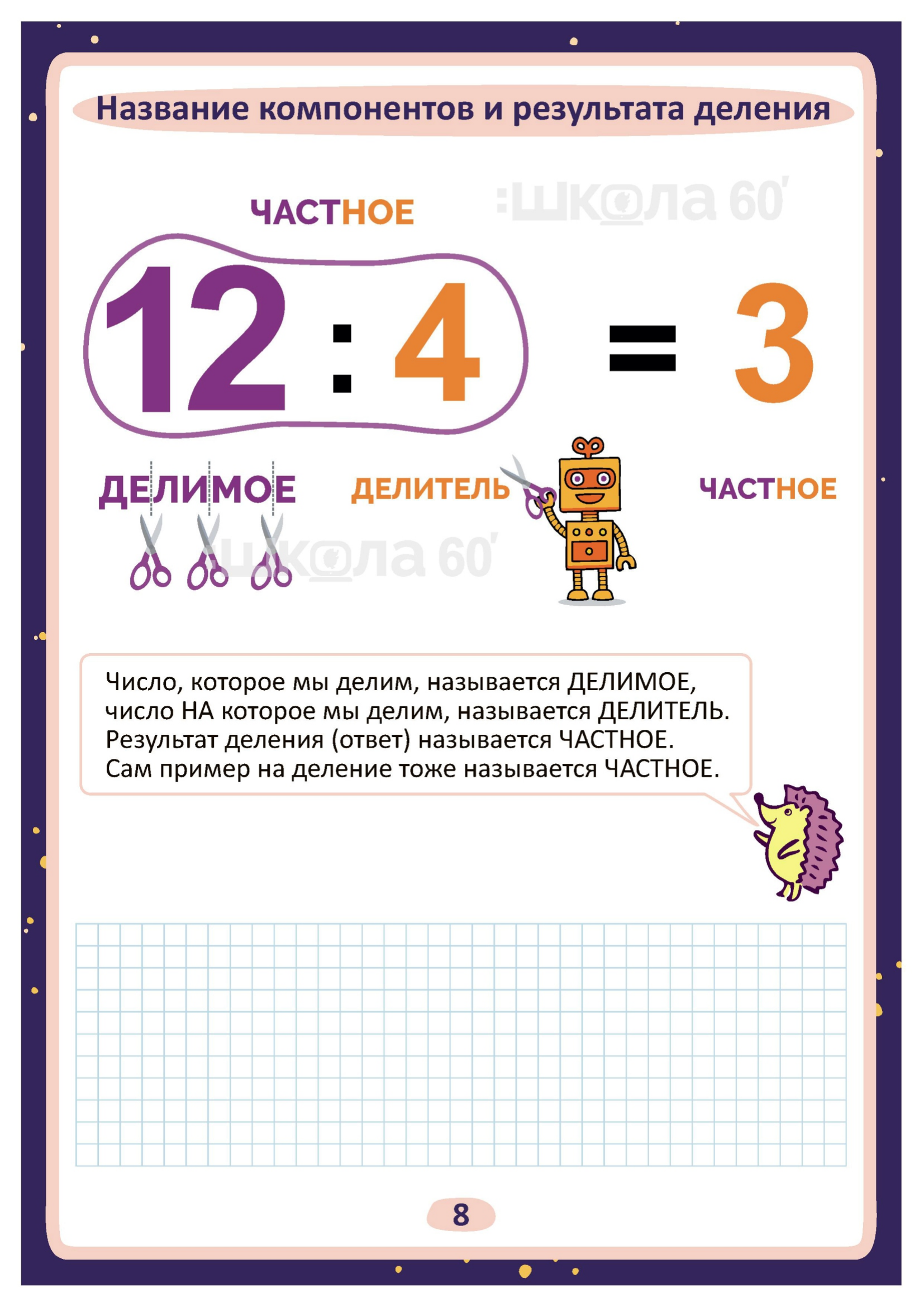 Графические авторские cхемы, которые позволяют наглядно увидеть тему, систематизировать, разобраться в ней, запомнить и конечно, легко повторить в конце четверти перед контрольными или аттестацией. Какие темы входят в помогаторы:4 класс Название компонентов и результата сложения Название компонентов и результата вычитания Выражения с переменной Решение уравнений Принципы умножения Название компонентов умножения Название компонентов деления Связь деления и умножения Умножение на 1 Умножение на 0 Перестановка множителей Таблица умножения - ракета Умножение суммы на число Деление с остатком Порядок выполнения действий Цена. Количество. Стоимость Масса. Количество Больше / меньше НА Больше / меньше В несколько раз Периметр Площадь Дроби Единицы времени Единицы массы Единицы длины Таблица разрядов и классов Увеличение и уменьшение чисел в 10 раз, в 100 раз Представление многозначных чисел в виде суммы разрядных слагаемых. Сравнение трёхзначных чисел Сложение и вычитание в столбик Умножение в столбик Деление в столбик Скорость. Время. Расстояние