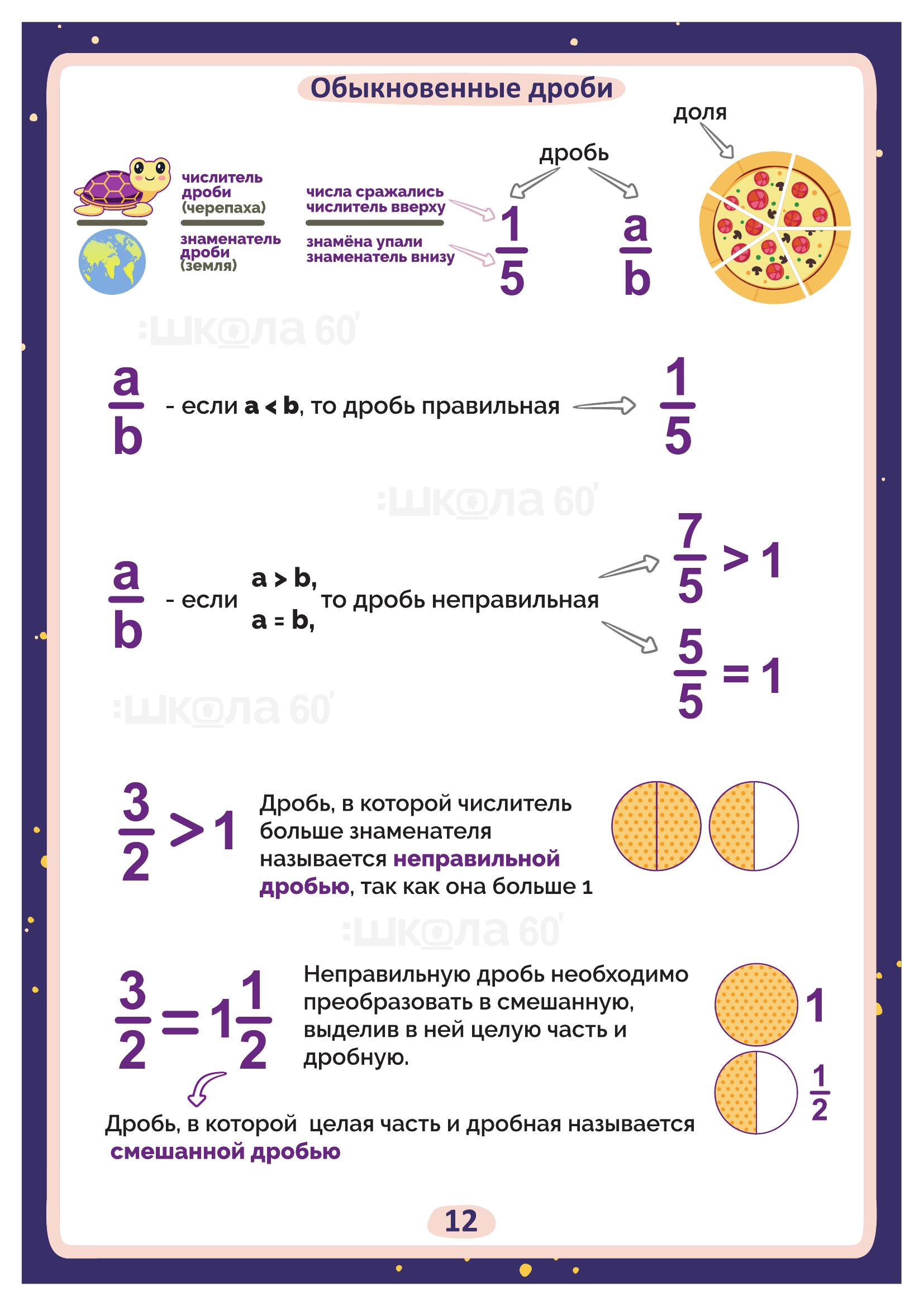 Графические авторские cхемы, которые позволяют наглядно увидеть тему, систематизировать, разобраться в ней, запомнить и конечно, легко повторить в конце четверти перед контрольными или аттестацией. Какие темы входят в помогаторы:6 класс Цифры и числа Натуральные числа Простые числа от 2 до 997 Натуральные числа Признаки делимости Разложение на простые множители Наибольший общий делитель (НОД) Взаимно простые числа Наименьшее общее кратное (НОК) Обыкновенные дроби Основное свойство дроби Сокращение дробей Приведение к общему знаменателю Сложение дробей Вычитание дробей Переместительный закон умножения Сочетательный закон умножения Распределительный закон умножения Деление дробей Пропорция Основное свойство пропорции Масштаб Окружность Круг и окружность Число Пи Площадь круга Шар Рациональные числа Положительные и отрицательные числа Модуль числа Сравнение чисел Сложение чисел с помощью координатной прямой Действия с отрицательными числами Рациональные числа Решение уравнений Коэффициент Перпендикулярные прямые Параллельные прямые Система координат на плоскости Диаграммы