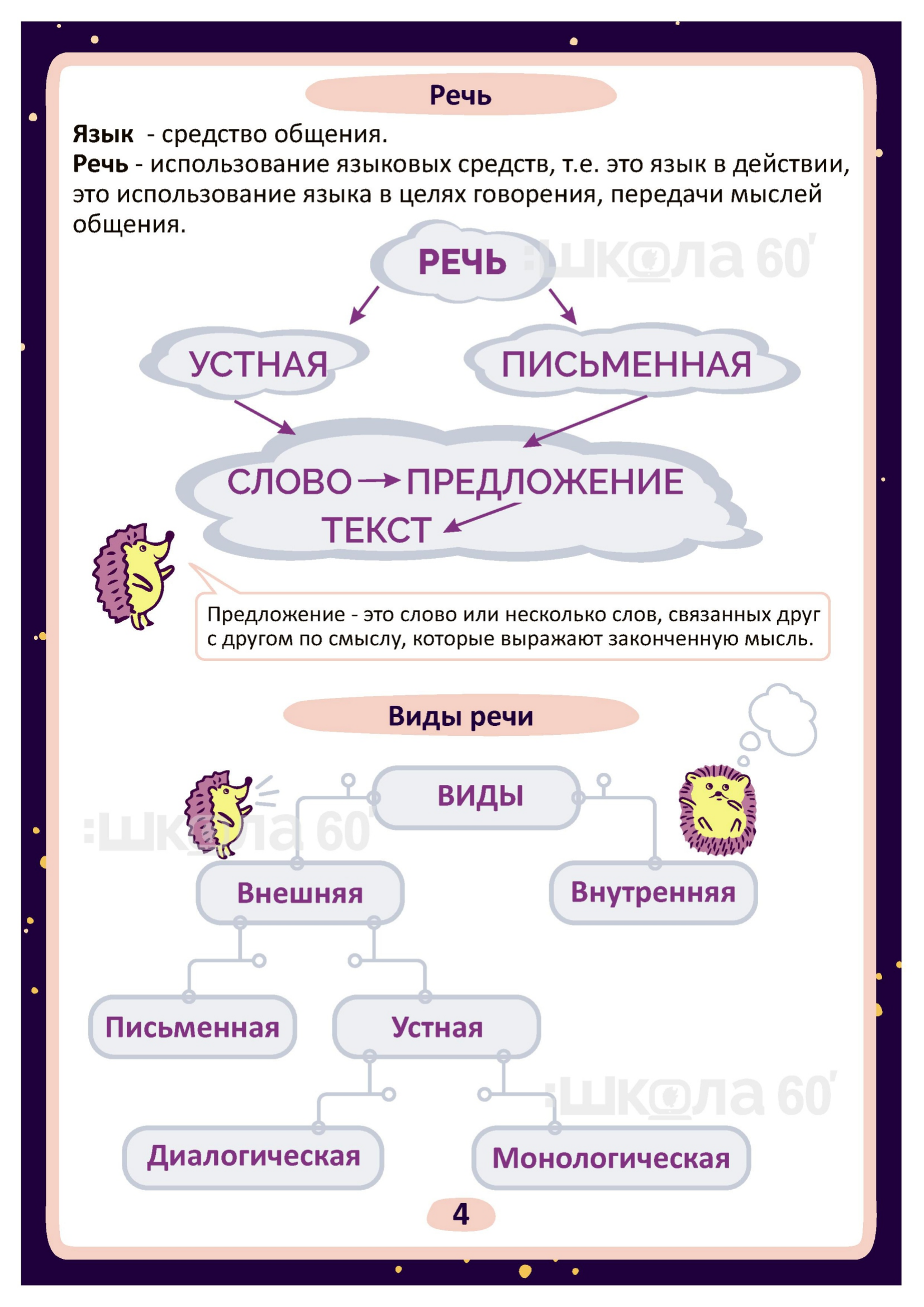 Графические авторские cхемы, которые позволяют наглядно увидеть тему, систематизировать, разобраться в ней, запомнить и конечно, легко повторить в конце четверти перед контрольными или аттестацией. Какие темы входят в помогаторы:4 класс Речь Виды речи Речевой этикет Текст Типы текстов Определение типа текста Предложение по цели высказывания и интонации Главные члены предложения Простое и сложное предложение Предложение Словосочетание Однородные члены предложения Предложение с обращением Простые и сложные предложения Лексическое значение Фразеологические обороты Омонимы. Синонимы. Антонимы Синтаксический разбор предложения Фонетический разбор Однокоренные слова Разбор слова по составу Морфология Служебные части речи Самостоятельные части речи Изменение самостоятельных частей речи Наречие Гласные О, А на конце наречий Имя существительное Собственные и нарицательные имена существительные Одушевлённые и неодушевлённые имена существительные Изменение по числам имён существительных Род имён существительных Склонение имён существительных Несклоняемые имена существительные Имя прилагательное Изменение имён прилагательных по падежам Разряды имён прилагательных Морфологический разбор имени прилагательного Личные местоимения Морфологический разбор местоимения Глагол Наклонение глагола Спряжение глагола Как определить спряжение глагола? Безударные окончания глаголов Глагол. Прошедшее время Морфологический разбор глагола Орфограммы имён существительных Орфограммы имён прилагательных Орфограммы глаголов Орфограммы Безударные гласные Парные согласные Разделительные Ъ и Ь Слова с непроизносимыми согласными Слова с удвоенными согласными Правописание приставок Суффиксы -ек, -ик Правописание приставок и предлогов Мягкий знак после шипящих Буквосочетания ЧК, ЧН, НЧ, НЩ, РЩ Виды разборов