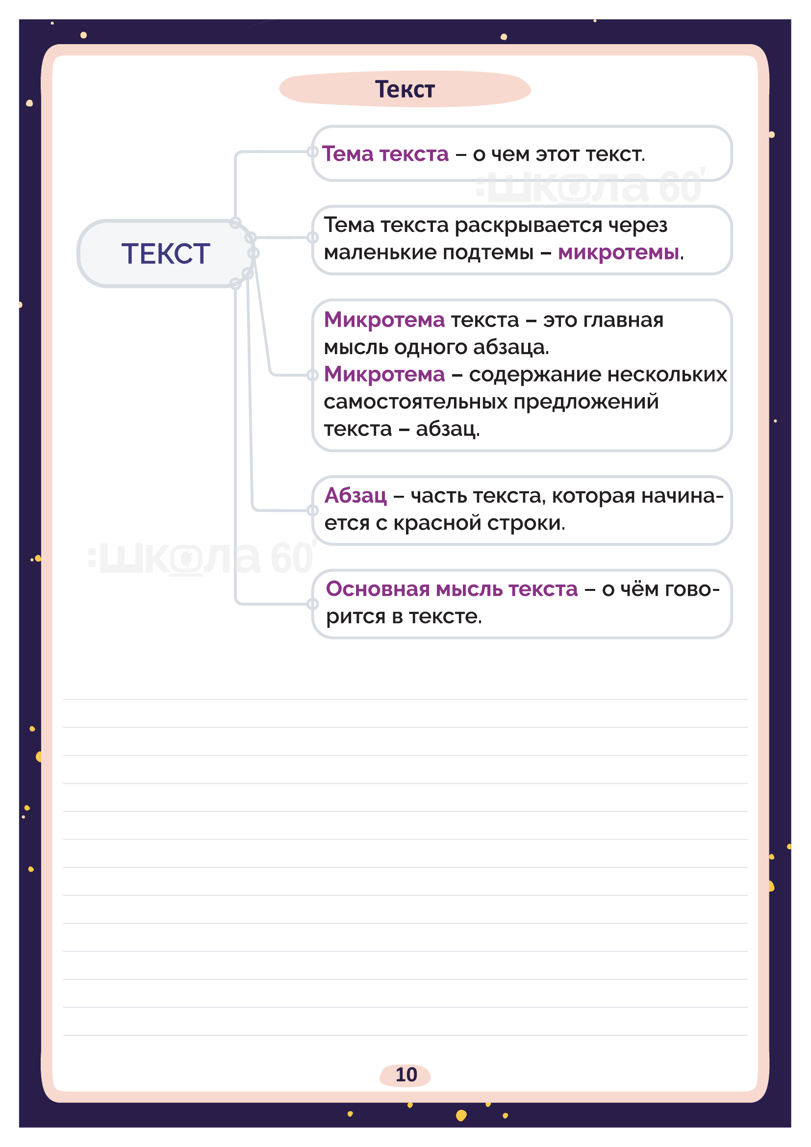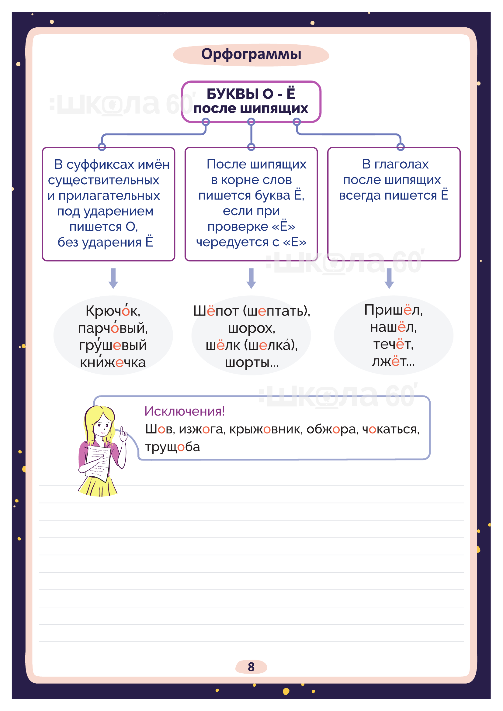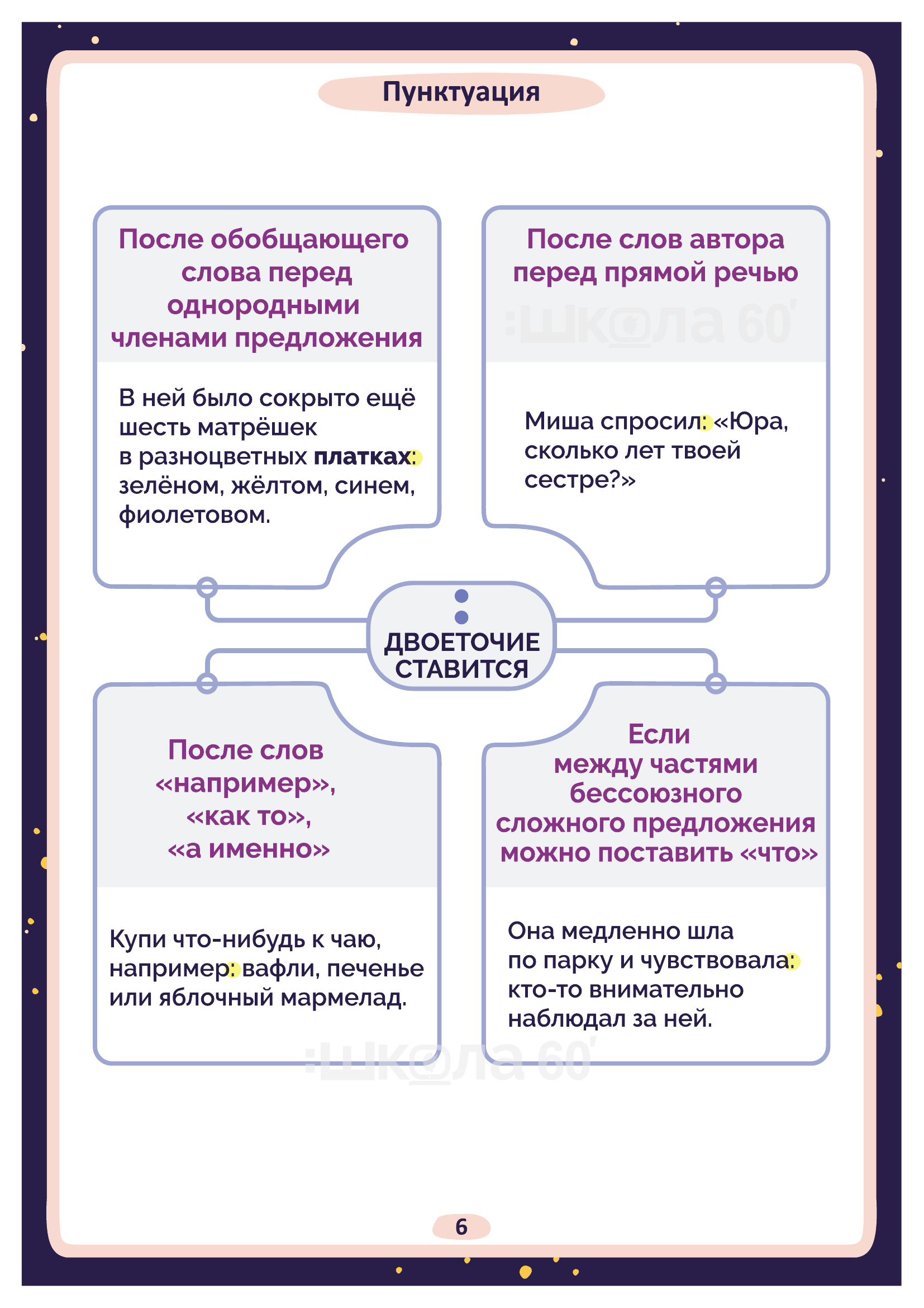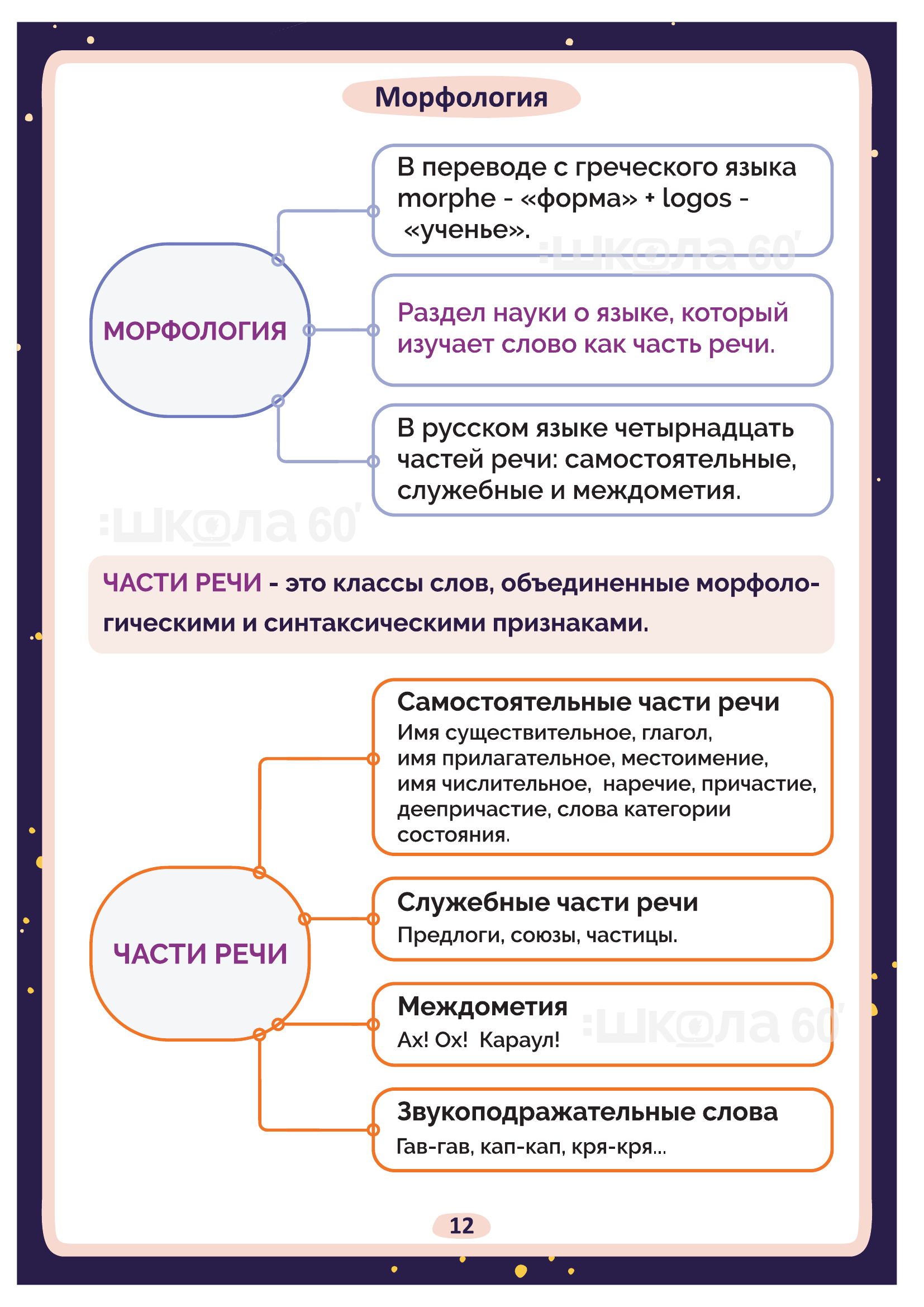 Графические авторские cхемы, которые позволяют наглядно увидеть тему, систематизировать, разобраться в ней, запомнить и конечно, легко повторить в конце четверти перед контрольными или аттестацией. Какие темы входят в помогаторы:6 класс Науки о языке и что они изучают Пунктуация. Запятая Пунктуация. Двоеточие Приставки Орфограммы. БУКВЫ о - ё после шипящих Орфограммы. Корни с чередованием гласных о - а, е - и Текст Схема написания сочинения Морфология Синтаксис Имя существительное Несклоняемые имена существительные Имена существительные общего рода Словообразование имён существительных Правописание сложных имён существительных Сравнительные обороты Орфоэпические нормы Культура речи Стили речи Разряды имён прилагательных Правописание сложных имён прилагательных Правописание -н-, -нн- в суффиксах сложных имён прилагательных Средства связи предложений в тексте Параллельная связь Вид глагола Буквы Ы – И в корне после приставок Прилагательное и причастие Причастие и глагол Причастный оборот Деепричастный оборот Причастие Морфологический разбор причастия Страдательные причастия Страдательные и действительные причастия НЕ с причастиями НЕ с деепричастиями Образование деепричастий Имя числительное Простые числительные Сложные числительные Составные числительные Склонение имён числительных Собирательные числительные Морфологический разбор имени числительного Имя числительное Местоимение Возвратное местоимение Притяжательные местоимения Указательные местоимения Определительные местоимения Отрицательные местоимения Неопределённые местоимения Образование неопределённых местоимений Морфологический разбор местоимения Виды разборов