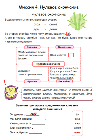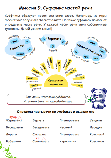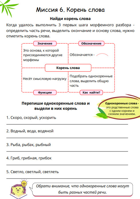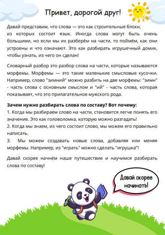Тренажёр «Разбор слова по составу» состоит из 10 миссий, где ребёнок знакомится с понятием «Морфема», их видами и функциями, учится поэтапно выполнять разбор слова по составу. А также выполняет интересные задания на отработку полученных знаний и отмечает свой прогресс на карте успеха!
