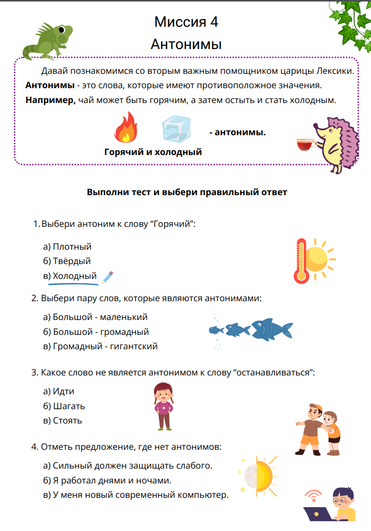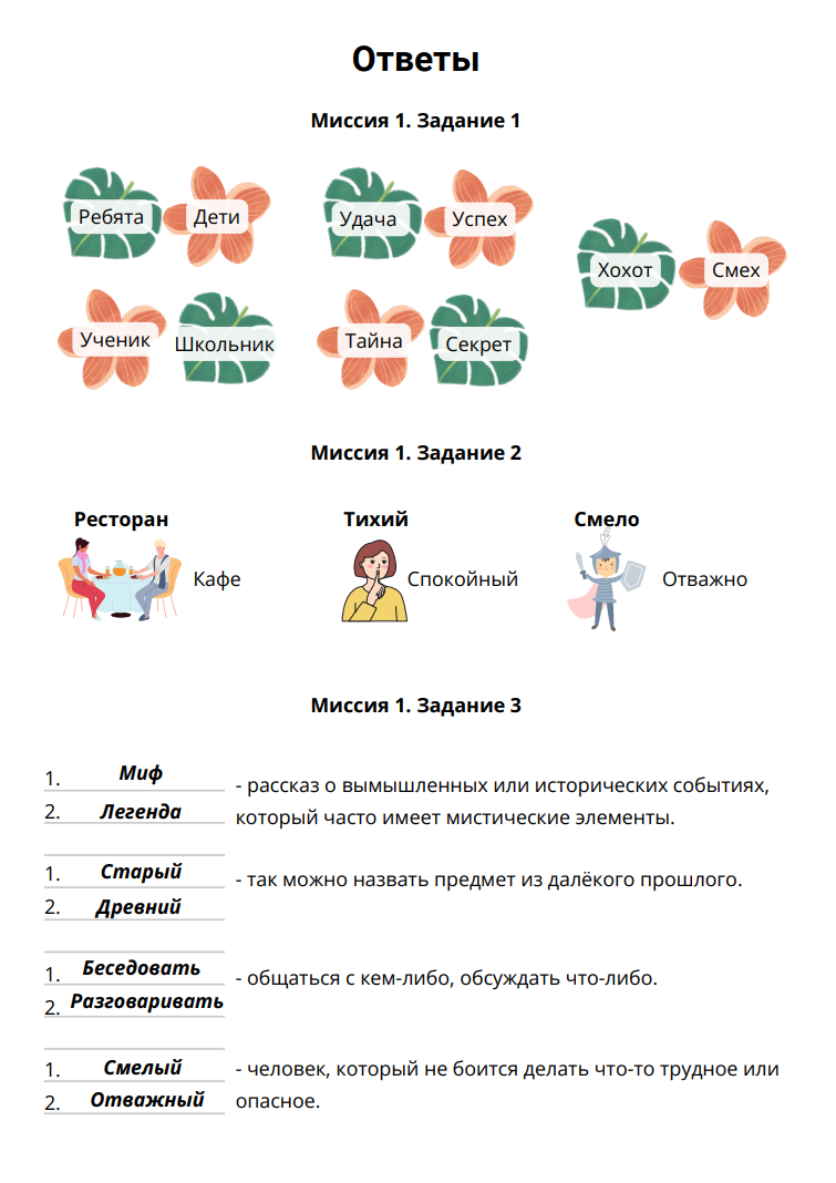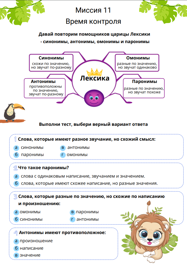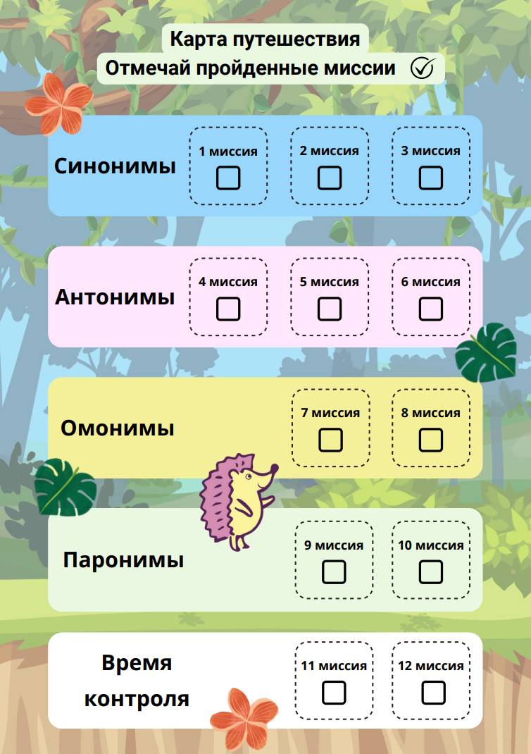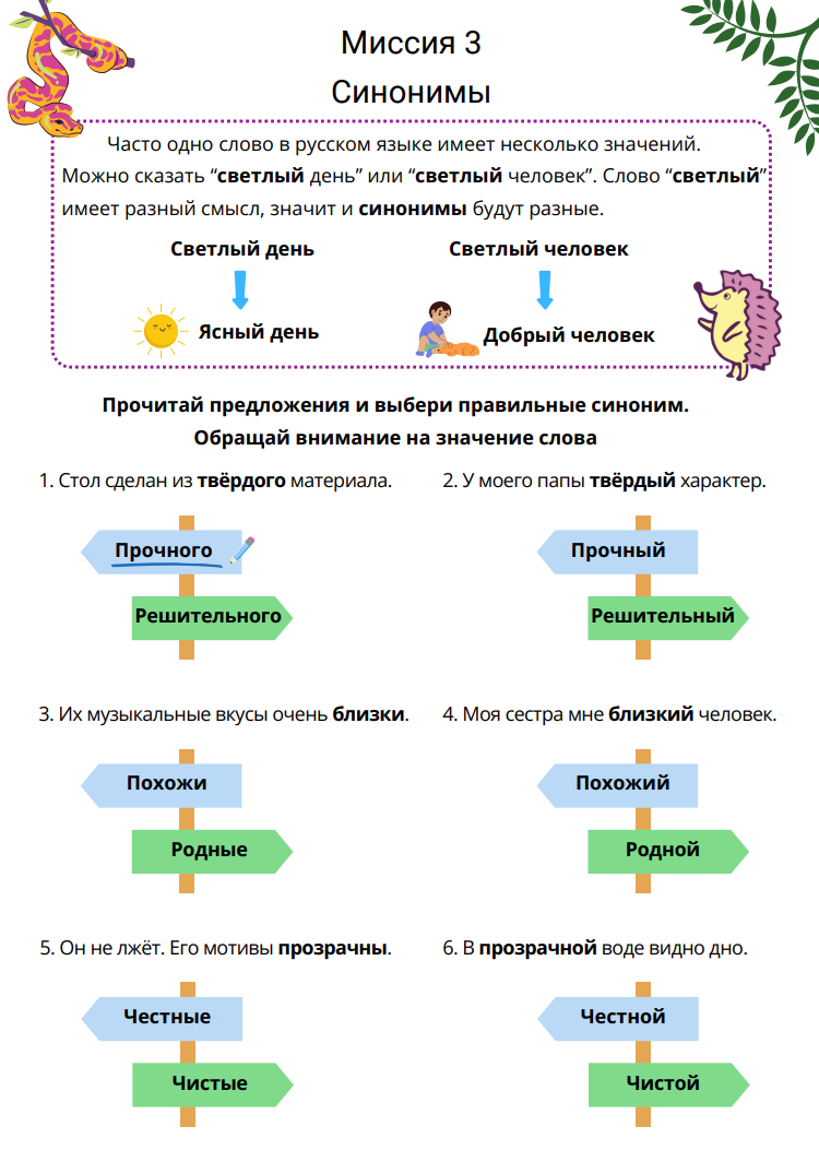 В каждой миссии ученик погружается в изучение одной из ключевых тем, узнаёт правила и закрепляет их с помощью разнообразных заданий. От простого сопоставления слов до более сложных задач на понимание контекста. С каждой пройденной миссией ученик будет всё увереннее использовать синонимы, антонимы, омонимы и паронимы русского языка.