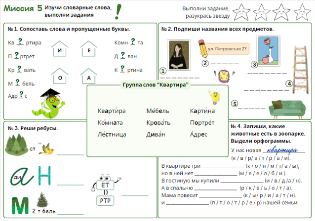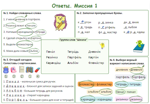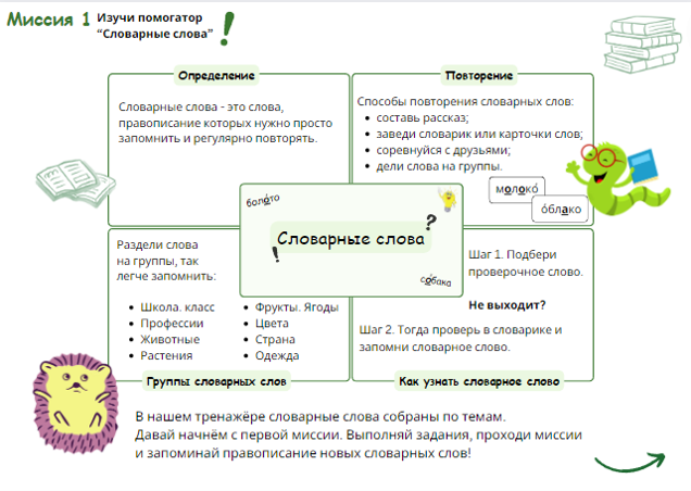В каждой миссии ученик знакомится с 9 новыми словарными словами по теме и выполняет различные упражнения на отработку нового материала. После завершения всех упражнений ребёнка ждёт итоговая миссия, которая поможет оценить полученные знания.