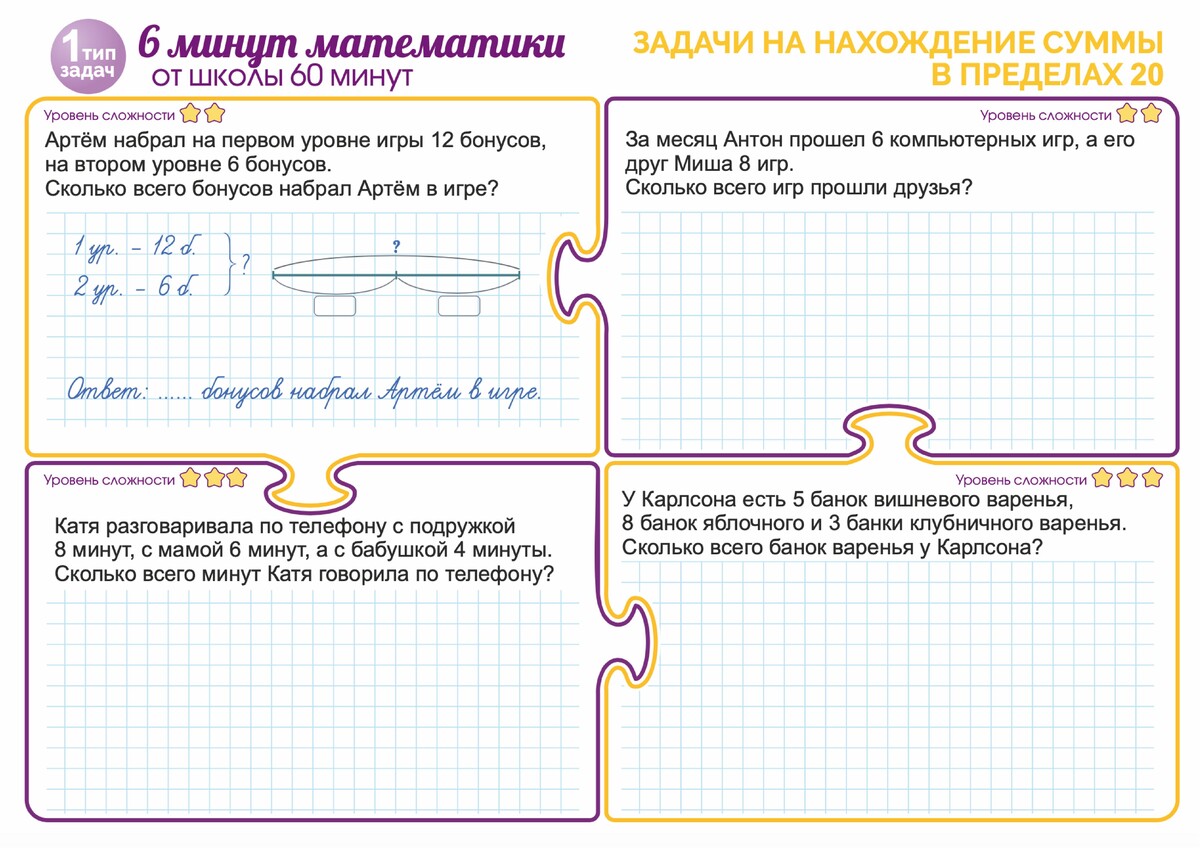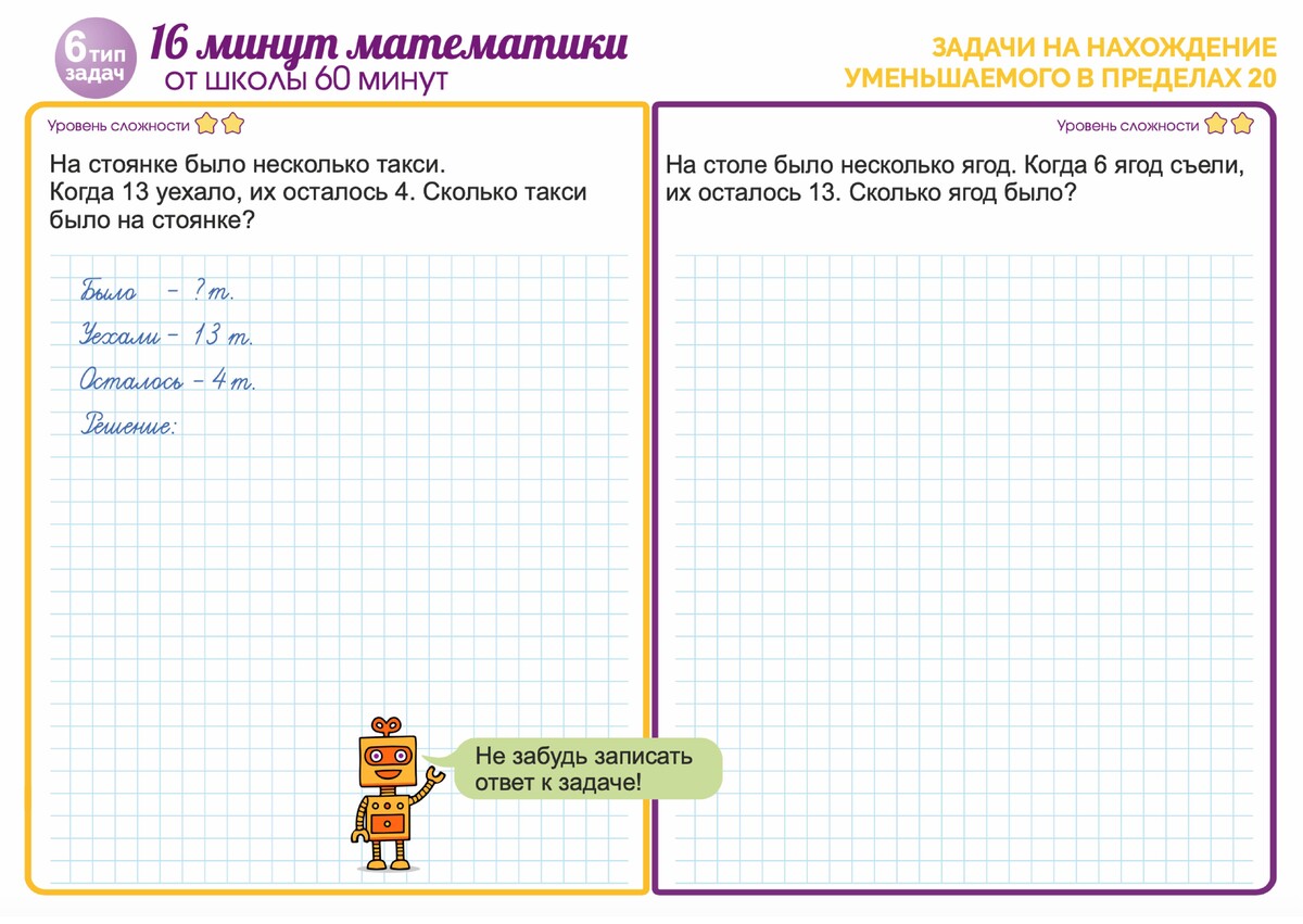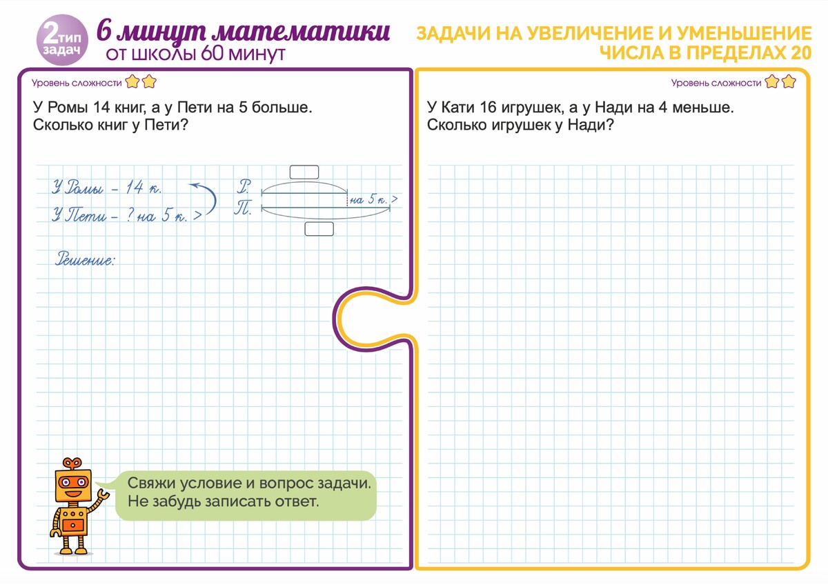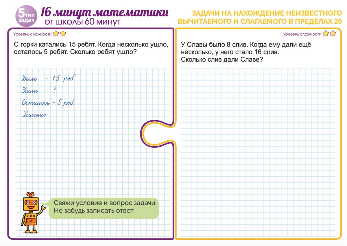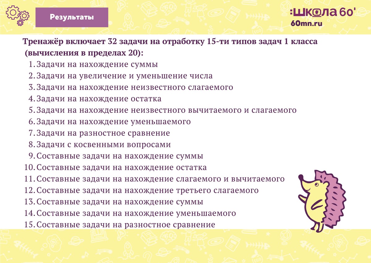 В результате занятий с тренажёром ребёнок познакомиться с типами задач 1 класса и научится их решать: оформлять краткую запись, делать чёртеж, рассуждать над решением задачи и оформлять решение.