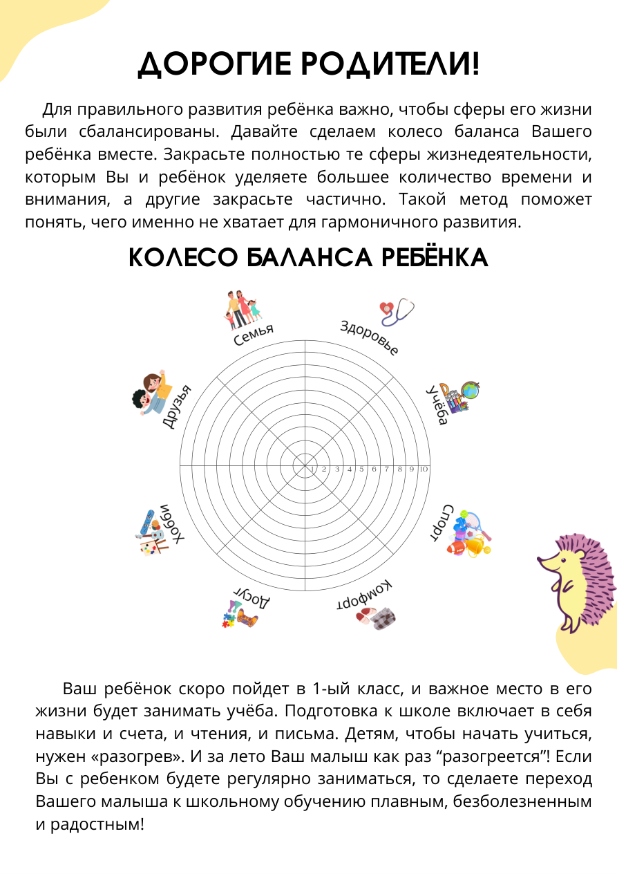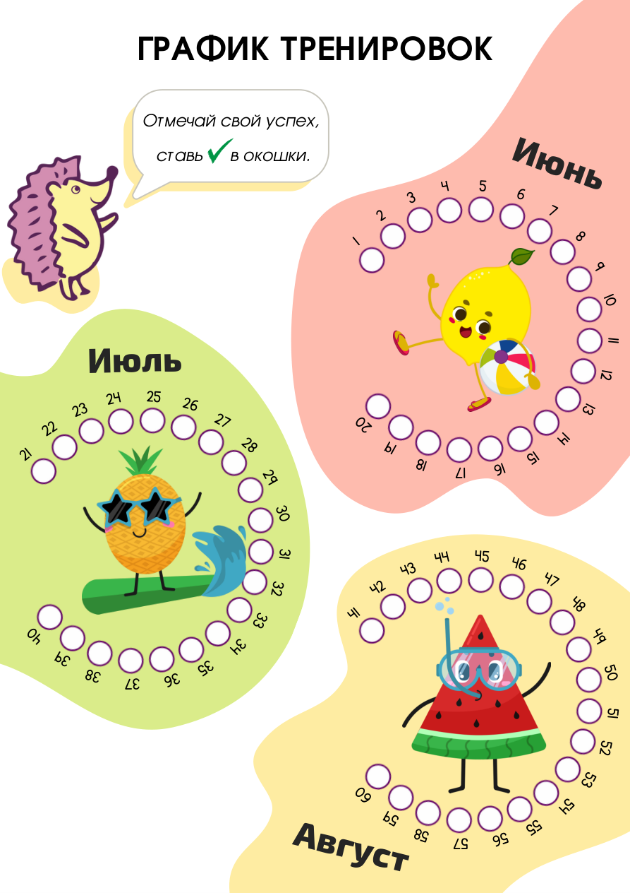 - Персонажи ёжик и пандочка, колесо баланса, график тренировок на каждый день лета.