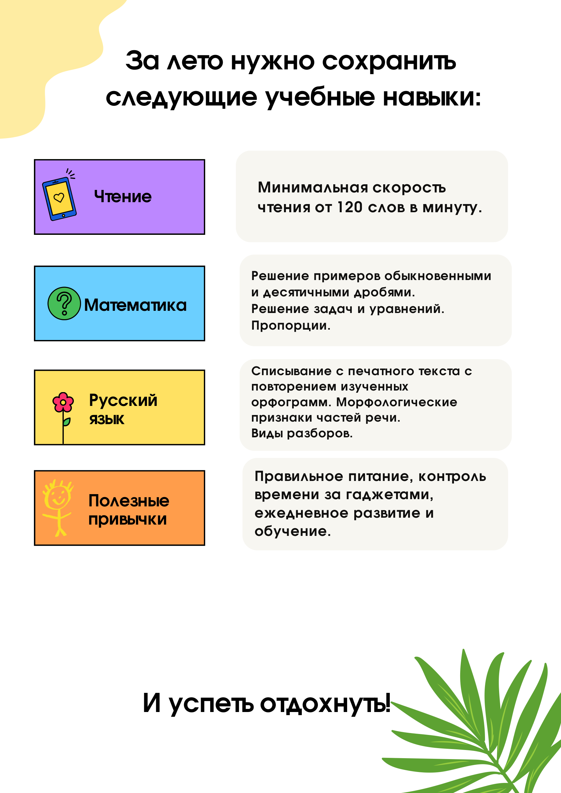Структура построена по принципу «лето по месяцам» — ребёнок занимается равномерно все три месяца, без перегрузок и скуки. Каждая тема даётся в игровой или полуигровой форме, чтобы сохранить интерес на протяжении всего лета.