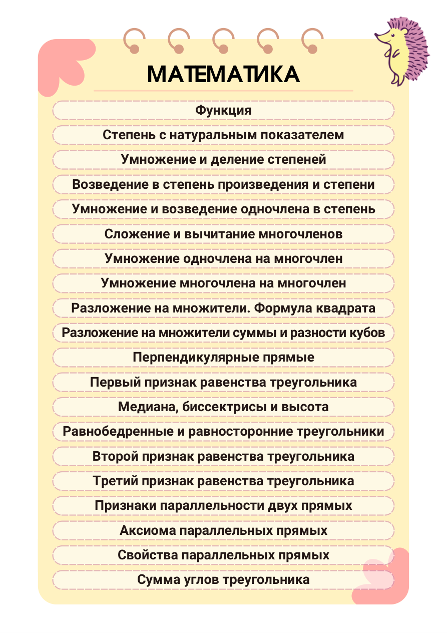 - Функции, одночлены и многочлены, треугольники, степени, формулы сокращённого умножения; базовая лексика и грамматика английского.