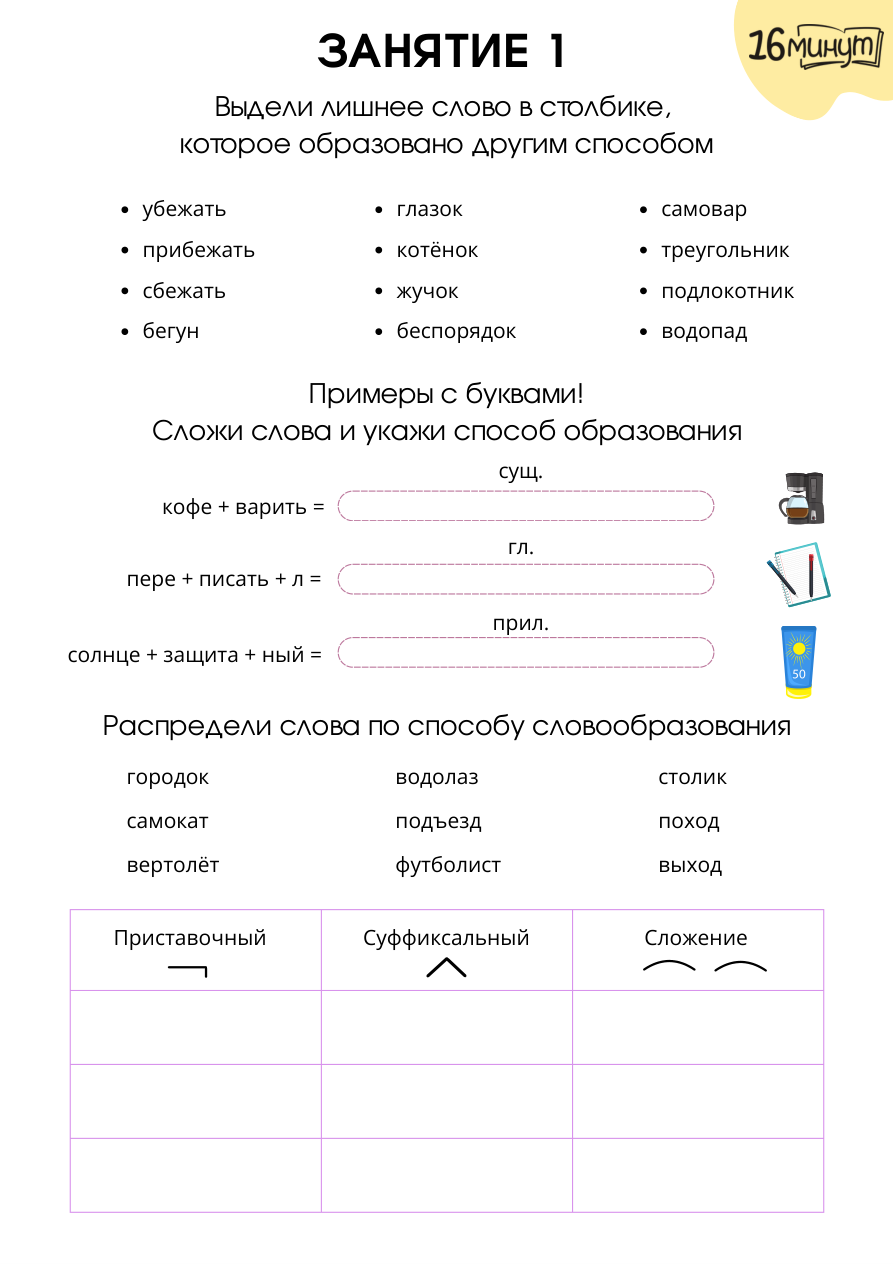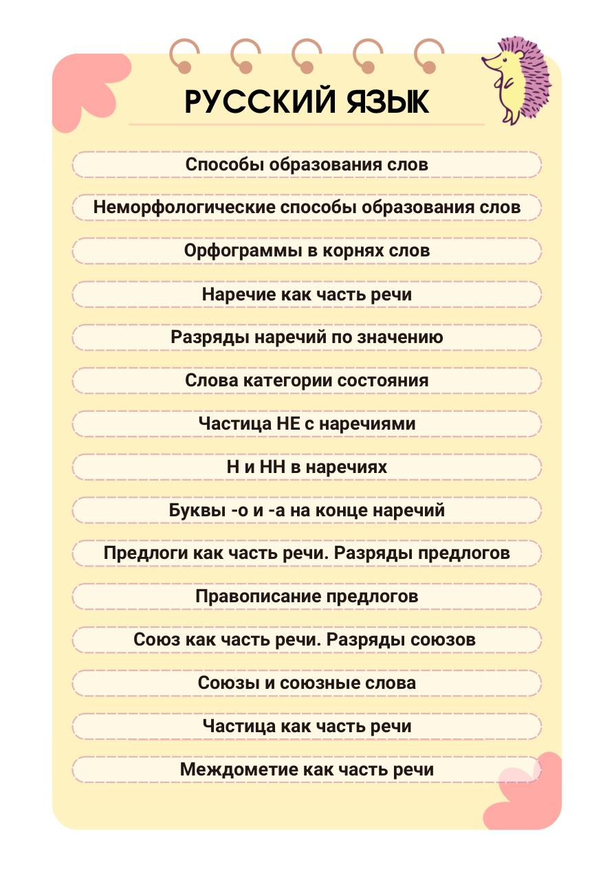 - Образование слов (суффиксальный, приставочный, приставочно-суффиксальный, сложение), наречия, предлоги, союзы, частицы, ни–нн в наречиях.